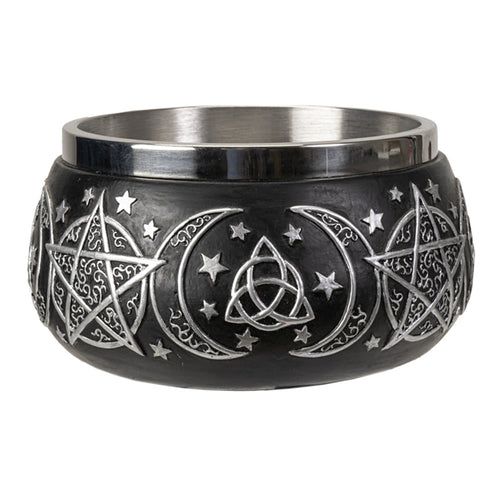 Channel lunar energy and sacred geometry with this hand-painted Triple Moon Pentagram Smudge Bowl. Crafted from durable composite resin and lined with stainless steel for reliable heat resistance, it's a beautiful, practical centerpiece for smudging, incense burning, and intention work.