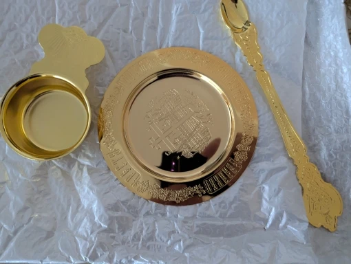 Honor sacred moments with this gold-plated baptismal set. The refined chalice (grail), paten plate, and ritual spoon are crafted from durable metal for reverent presentation and everyday parish use.