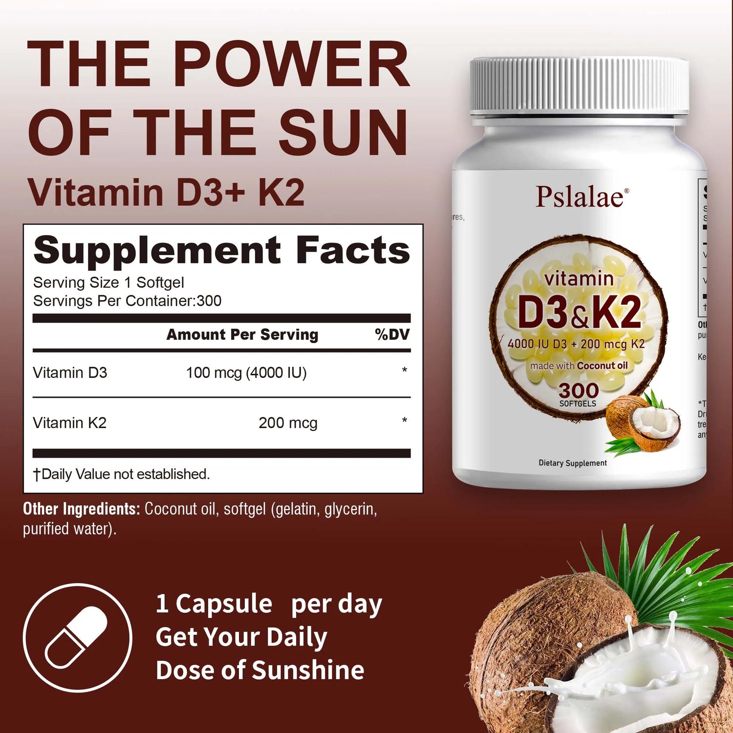 Pslalae Vitamin D3 + K2 Coconut Oil Softgels