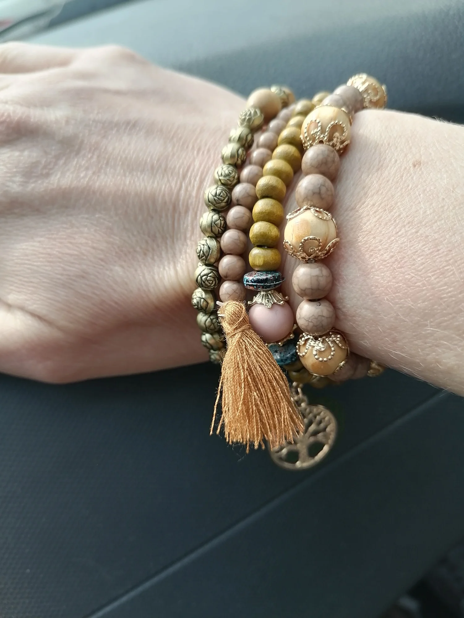 Add a touch of bohemian charm to your style with this 4-piece handmade bracelet set. Featuring natural wood beads, a chic Tree of Life charm, and layered designs, these bracelets bring elegance, meaning, and versatility to your everyday look. Perfect for stacking or wearing solo.