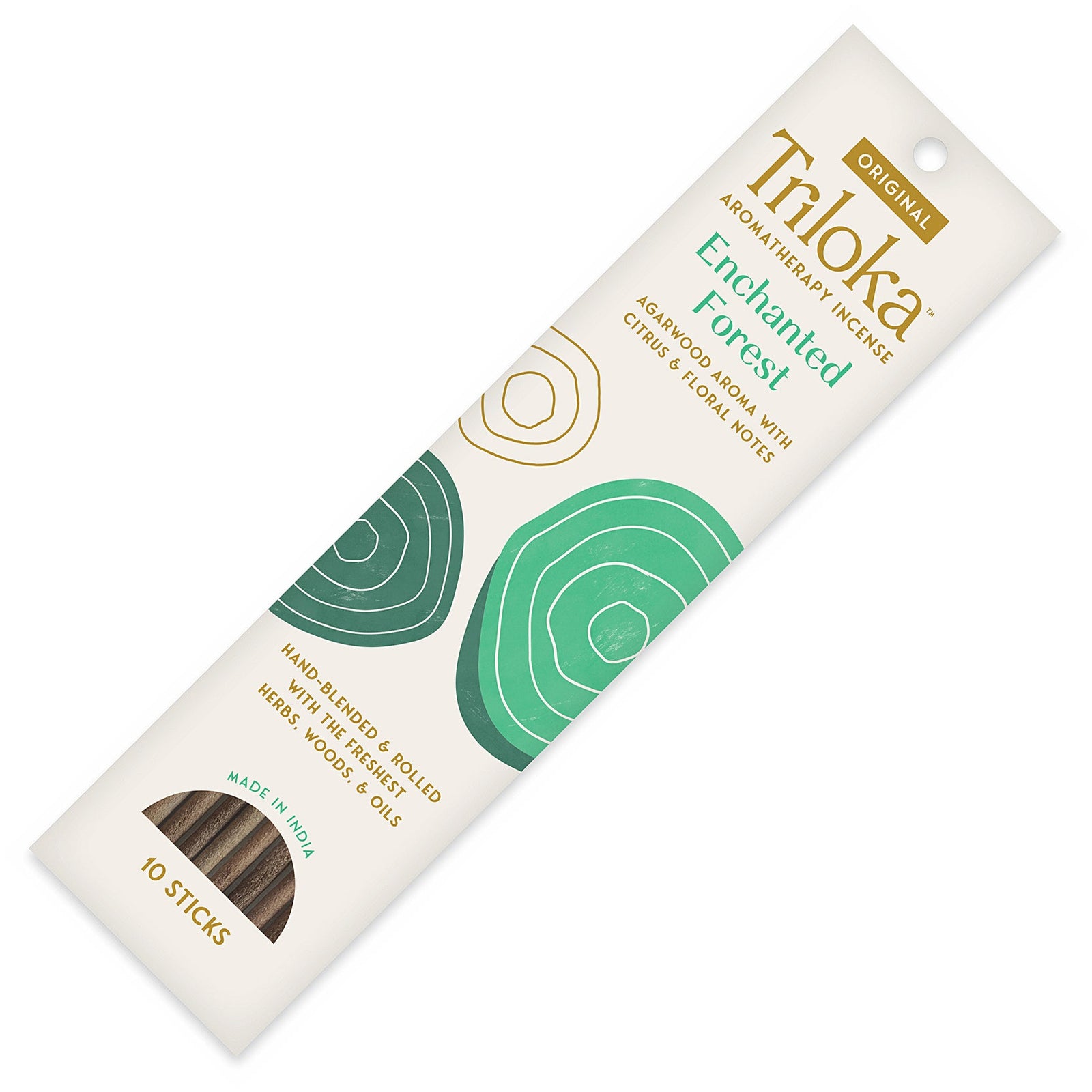 Step into a calming grove with Triloka's Enchanted Forest. This hand-rolled masala incense blends rich agarwood with sparkling citrus and soft florals to elevate your mood and wrap your space in a serene, inspiring aroma.