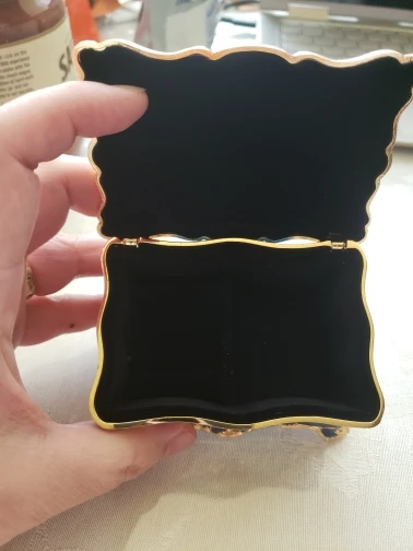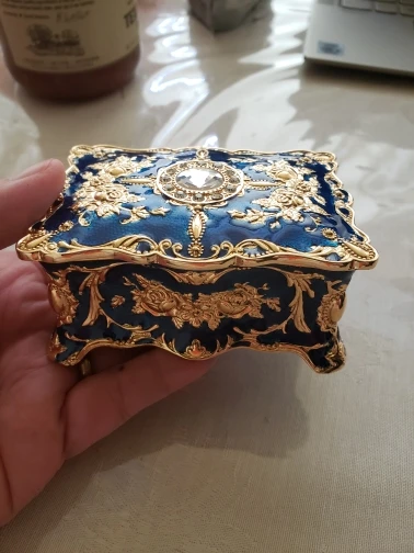 A petite, European-style jewelry box crafted in rust-resistant alloy with hand-painted color-tin accents and sparkling inlay. Soft dual-layer velvet lines the interior to cradle rings, necklaces, and small treasures—perfect as a refined gift or dresser showpiece.