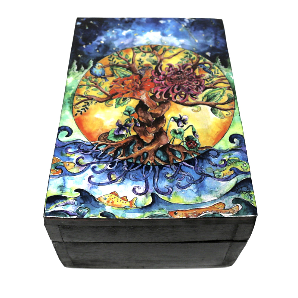 Keep your treasures safe—and beautifully displayed—with our Tree of Life Wooden Box. The detailed print features the Tree of Life under a starlit sky, surrounded by plants, birds, and fish—perfect for storing crystals, jewelry, tarot cards, herbs, oils, and more.