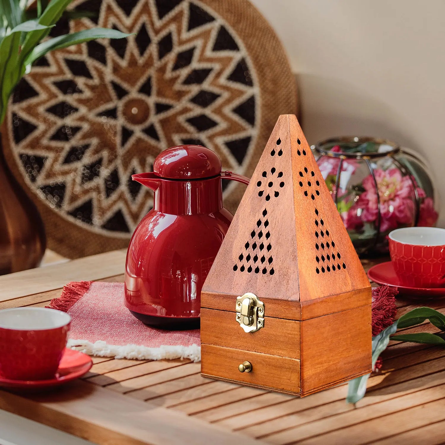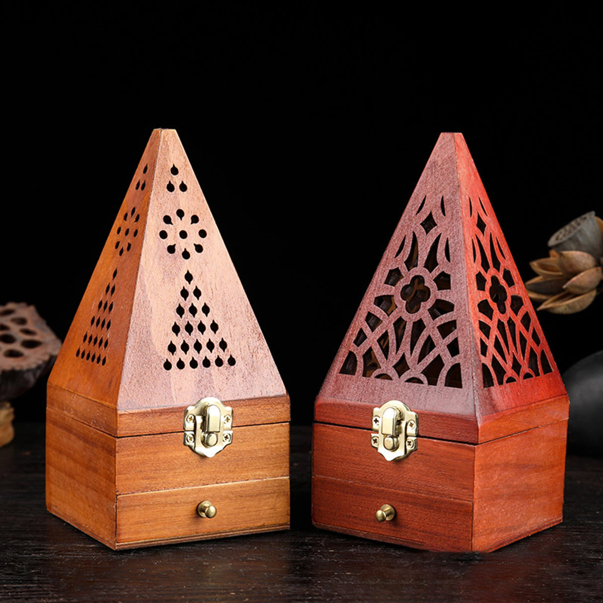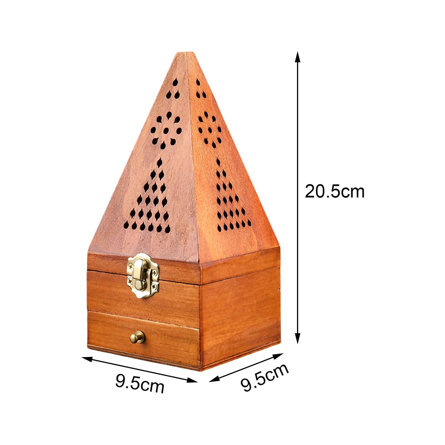 Infunde serenidad y estilo a tu espacio con este quemador de incienso de madera. Fabricado en madera natural con un diseño de inspiración vintage, cuenta con una tapa piramidal, un discreto cajón recogedor de cenizas y una ventilación intrincada que libera la fragancia con elegancia. Perfecto para la meditación, el yoga o simplemente para añadir un toque decorativo cálido, mantiene las superficies limpias a la vez que llena tu hogar de aromas relajantes.