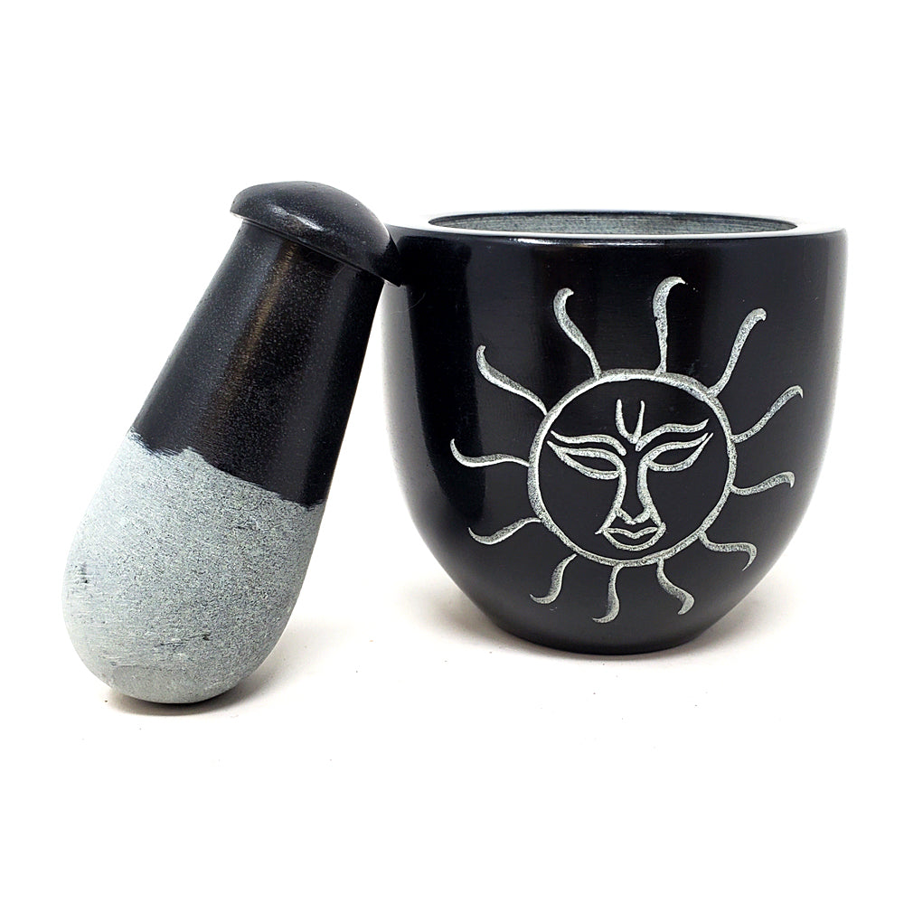 Sublimez votre cuisine ou votre pratique des herbes avec le mortier et pilon en stéatite noire sculptée soleil. Magnifiquement conçu avec un soleil sculpté sur le devant, cet ensemble mortier et pilon est à la fois fonctionnel et décoratif. Cet outil indispensable pour tout amateur de cuisine est parfait pour écraser et moudre aliments, herbes, graines et remèdes mystiques.